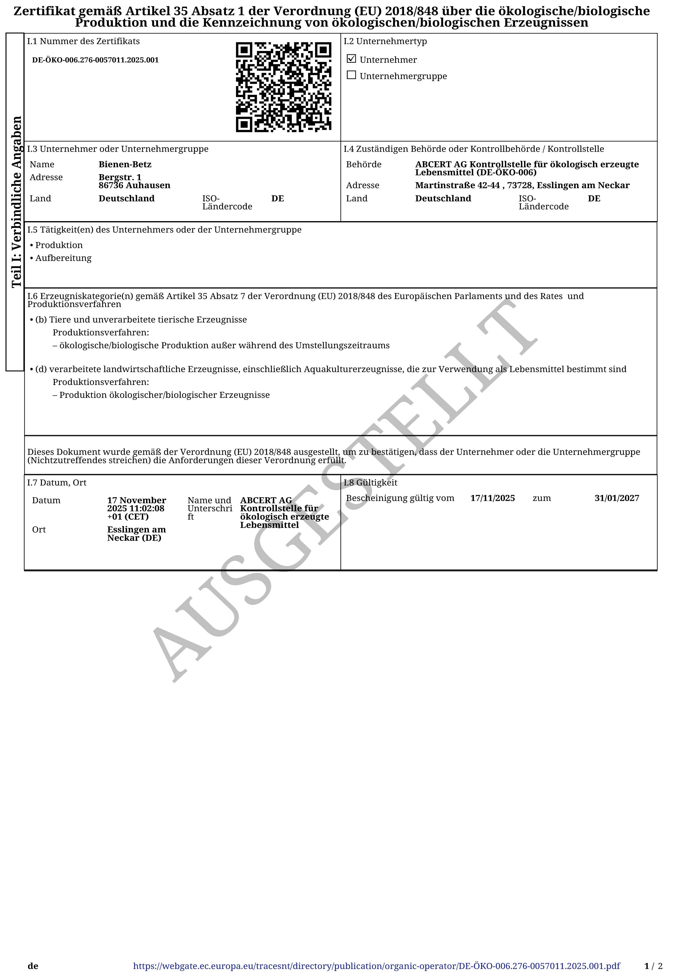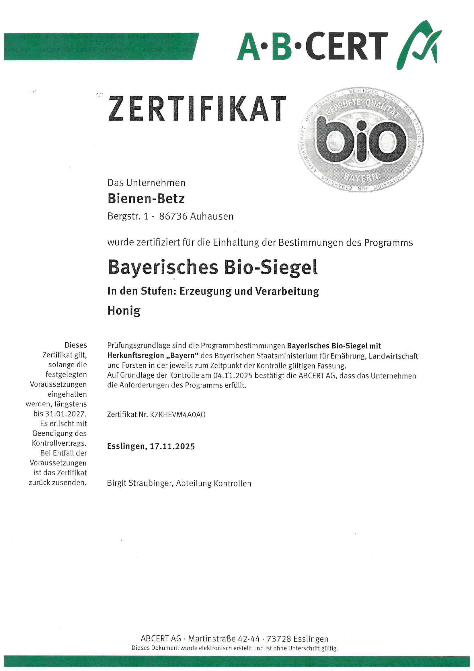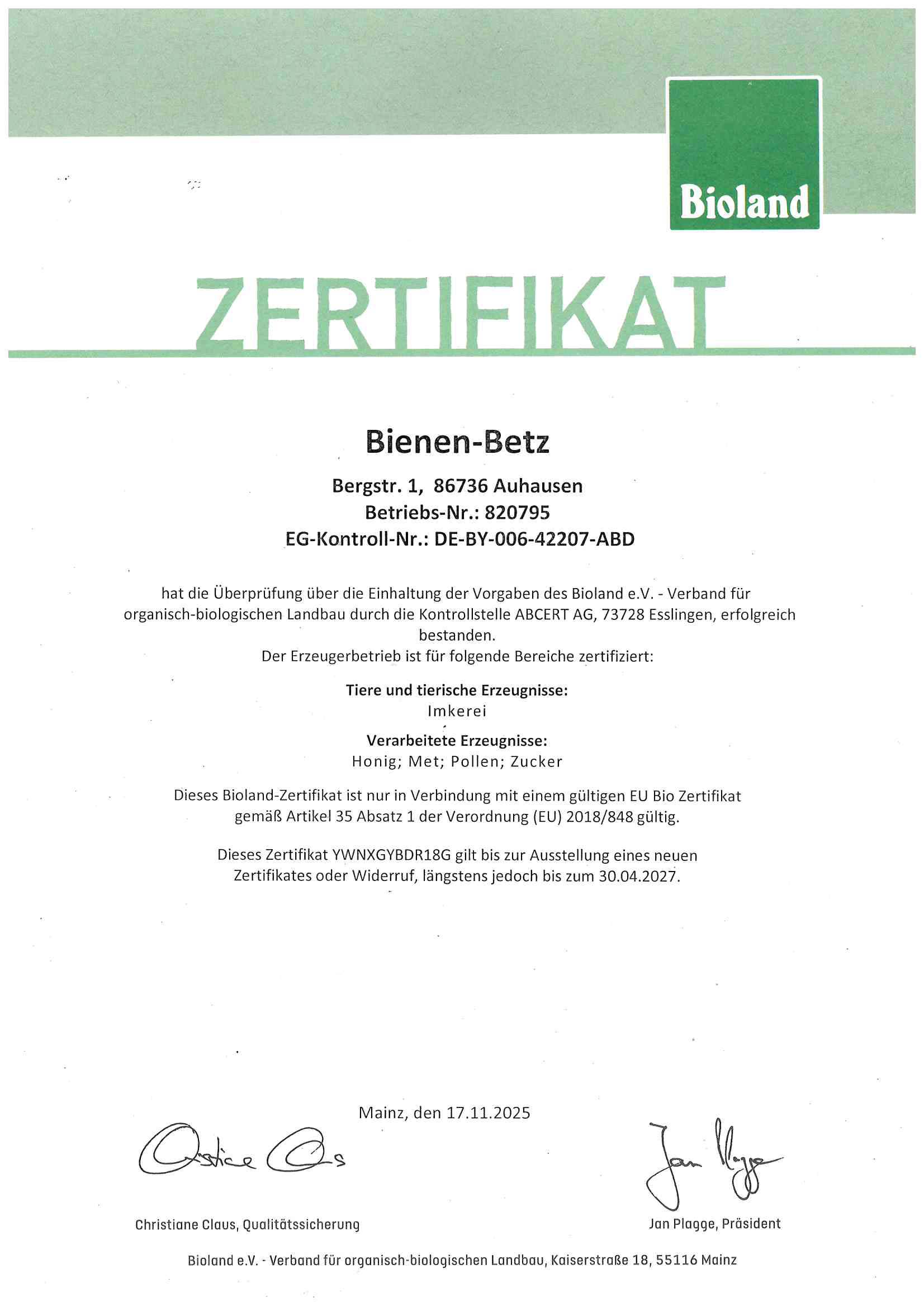 Am Standort Auhausen - nördliches Schwaben - gibt es schon seit 1934 Bienen. Die Berufsimkerei besteht seit 1990, seit 1995 sind wir Biolandzertifiziert. 2015 übernahm ich - Achim Betz - den Betrieb. Mittlerweile hat unser Betrieb 4 Festangestelle und 2 - 3 Saisonarbeiter. Seit unserer Gründung haben wir uns stetig erweitert und modernisiert.